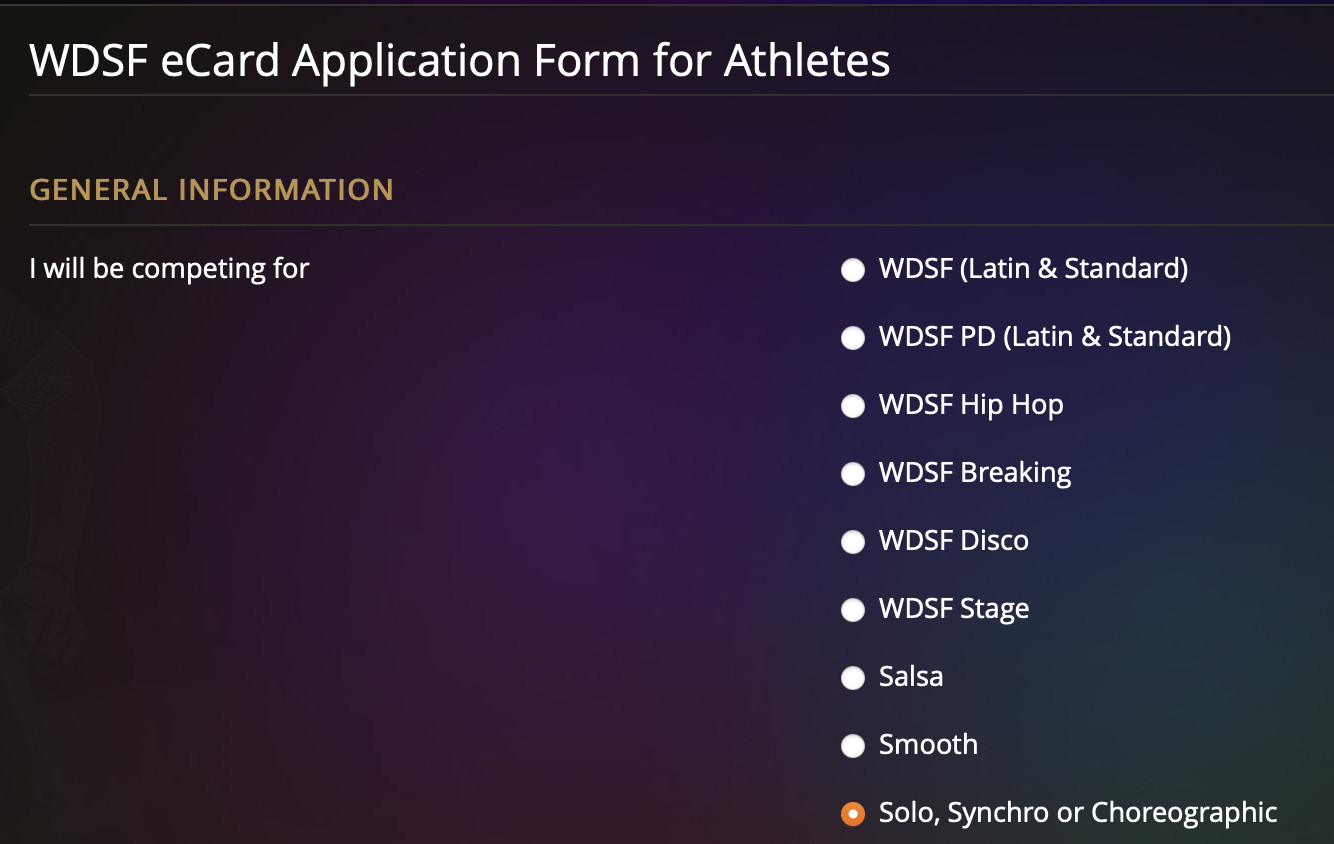 Ist noch keine WDSF-eCard vorhanden, so bitte bei der WDSF eine Lizenz zum Solo-Tanzen beantragen (hier).